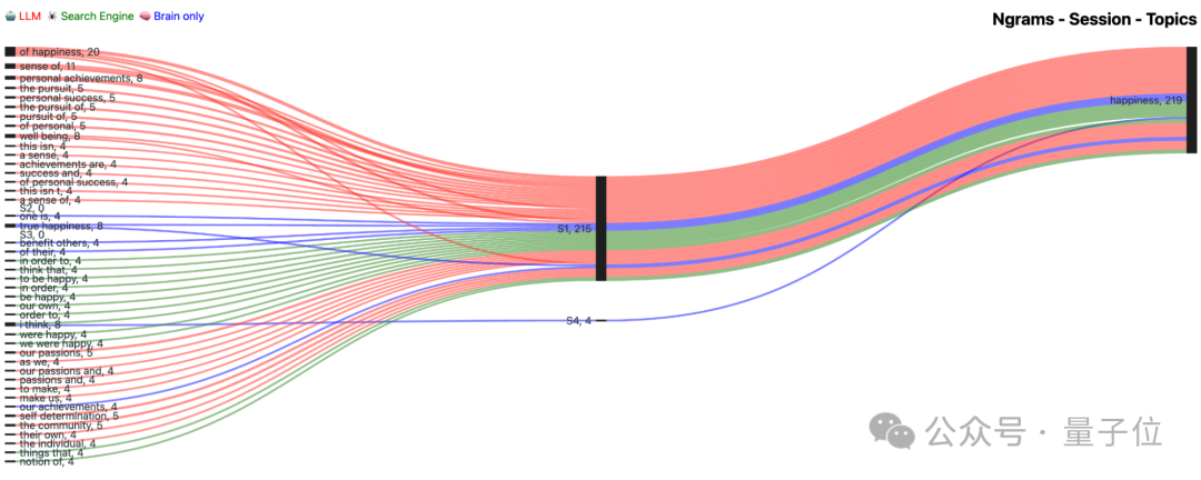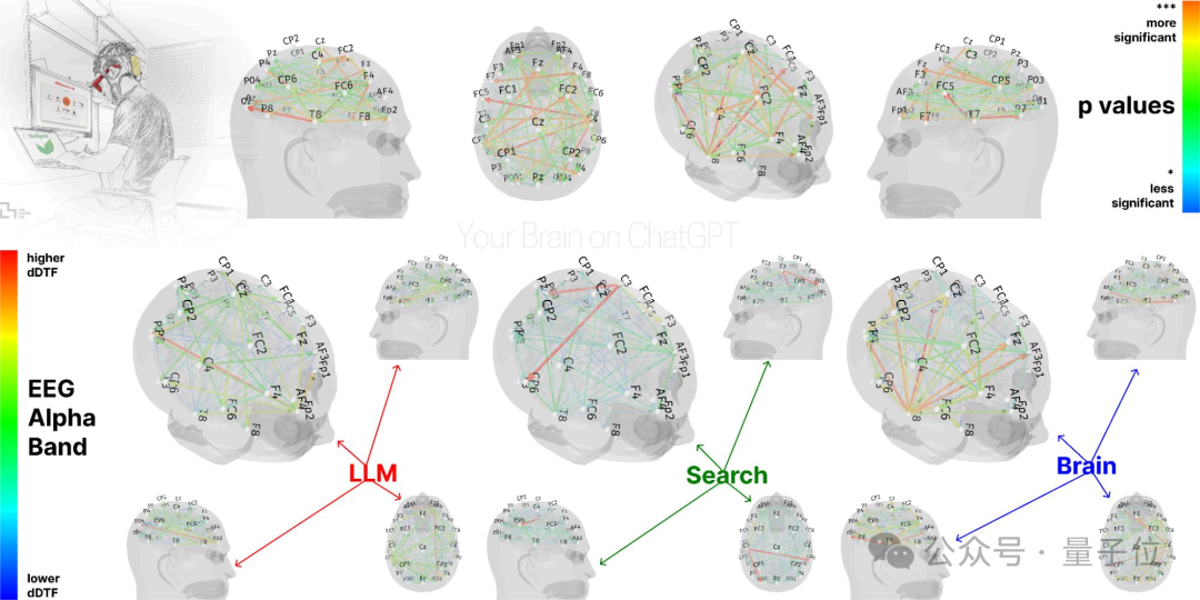 而使用LLM时神经连接则最弱,自主思考大幅度减少,使用搜索引擎时介于二者之间,因为需要自行整合外部信息,视觉皮层活动更多。