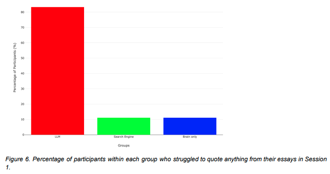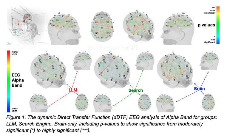 使用 Google 搜索的那组也表现不错。他们在写作时的大脑活跃度高,满意度也很强。这一差异值得注意——因为如今很多人已不再用搜索引擎,而是直接在 AI 聊天机器人中查找信息。