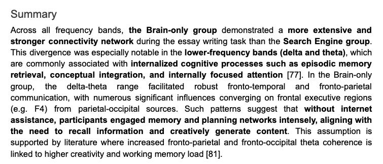 相比之下,“只用大脑”的那组人在 alpha、theta 和 delta 波段上的脑连接最强,而这些频段正与创造力、记忆负载和语义处理密切相关。研究人员发现,这组参与者更投入、更好奇,对自己写的内容也更满意、认同感更强。