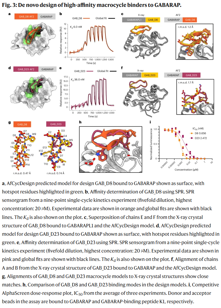 为验证对非α螺旋口袋结构的适应性,研究人员选择了GABARAP作为靶点,设计了约8万个模型,筛选出13个代表性设计用于实验。合成后测试发现GAB_D8和GAB_D23分别以6 nM和36 nM的亲和力与靶标结合。X-ray 晶体结构进一步证实其与设计模型高度一致,且具备破坏GABARAP-K1相互作用的能力,GAB_D8为目前已知亲和力最高的大环GABARAP结合物。