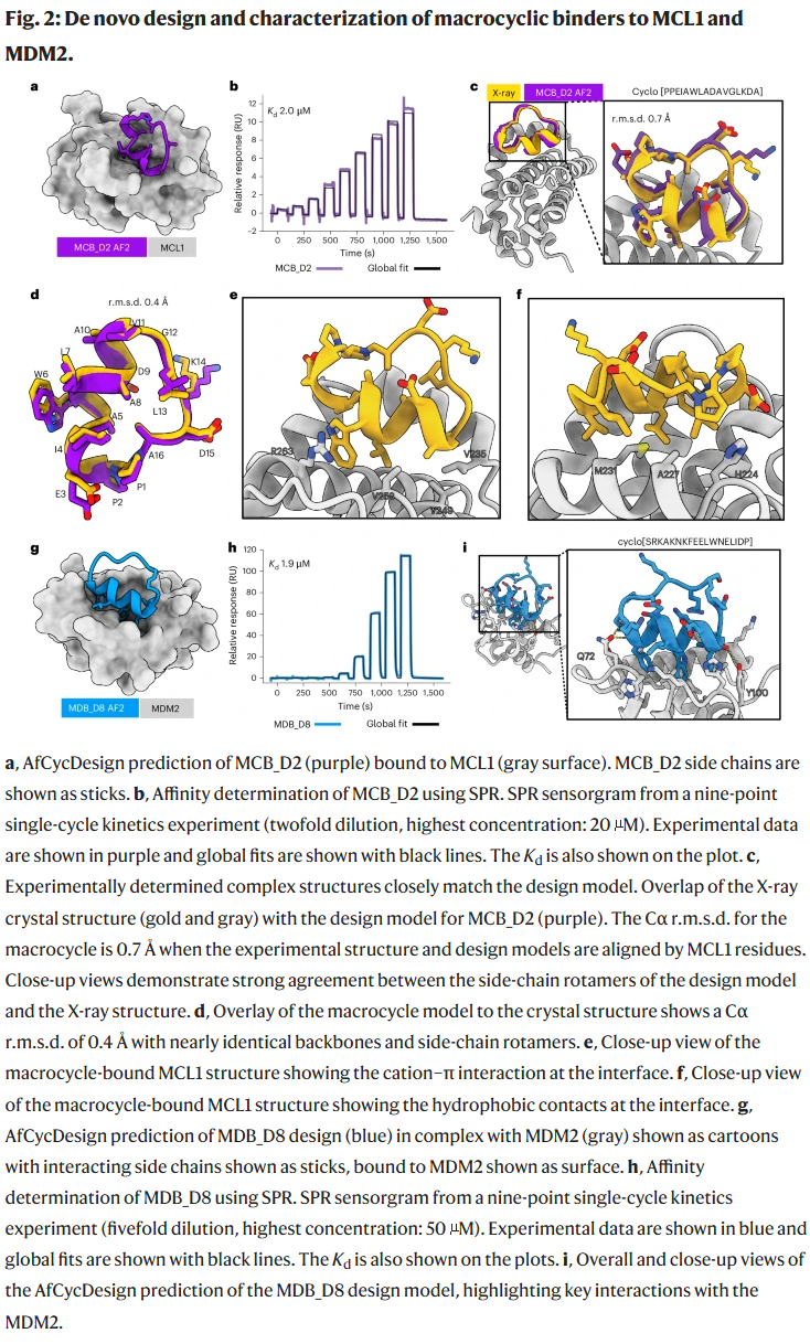 针对抗癌靶点MCL1,研究人员设计了约1万个大环主链,筛选后合成并测试了14种设计,其中3种表现出与MCL1结合能力,最佳设计MCB_D2的结合常数为2 µM。其晶体结构与设计模型一致性高(主链r.m.s.d.为0.7 Å)。