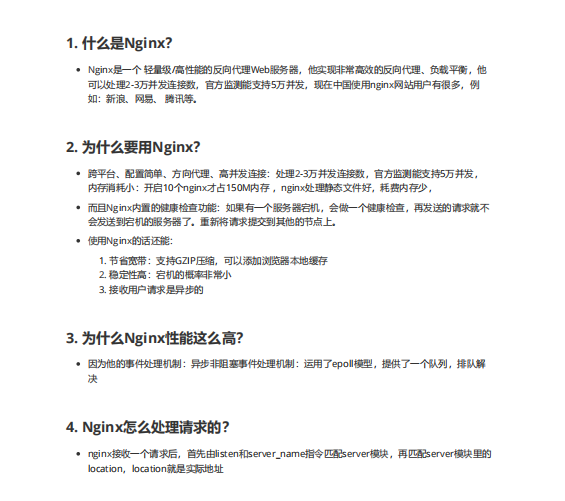 这是一份关于Nginx的面试题资料,它详细介绍了Nginx的基本概念、性能优势、配置方法、应用场景以及一些高级特性。以下是对这份资料的核心内容进行的详细梳理: