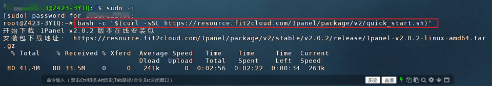 🔺接着输入1Panel一键安装脚本【bash -c "$(curl -sSL https://resource.fit2cloud.com/1panel/package/v2/quick_start.sh)"】并回车,然后系统就会自动下载安装包。