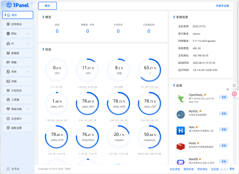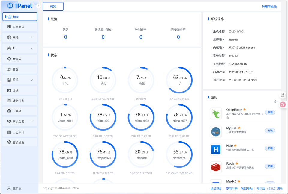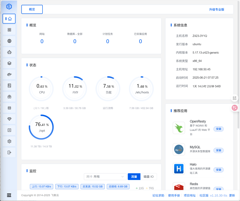 🔺1Panel的主页以图形化方式实时展示了CPU、内存、磁盘等硬件资源的使用情况,底部还有网络带宽的流入流出情况,这种直观的展示方式可以让我们实时的了解NAS系统的运行状态,及时发现异常问题。