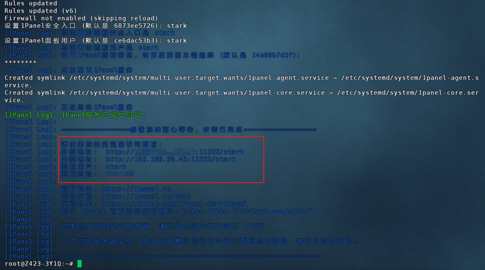 🔺之后1Panel就会自动启动,同时还会给出1Panel的登录信息,包括外部地址,内部地址,用户以及密码。