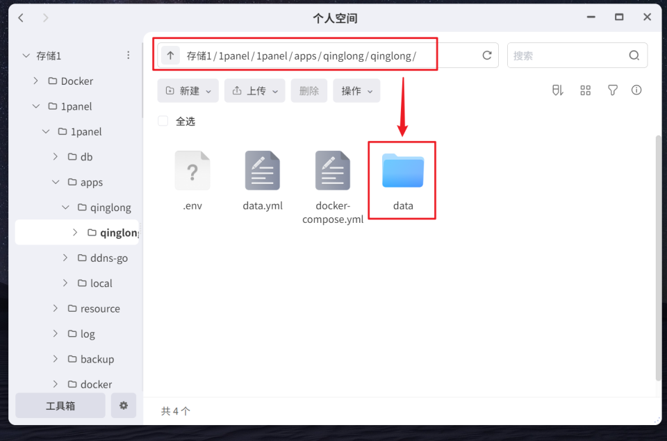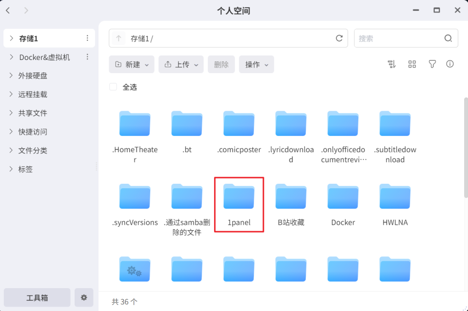 🔺首先我们需要在极空间的文件管理器中任意位置创建一个安装目录,我这里是直接在根目录中创建了一个“1panel”的文件夹作为它的安装目录。