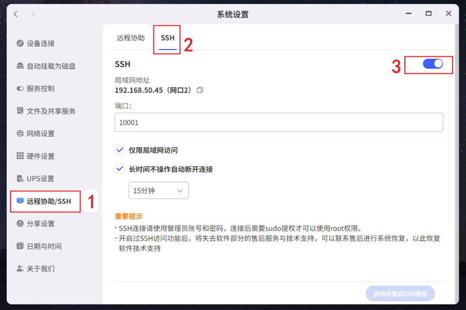 🔺然后在“系统设置”中启用极空间SSH功能。