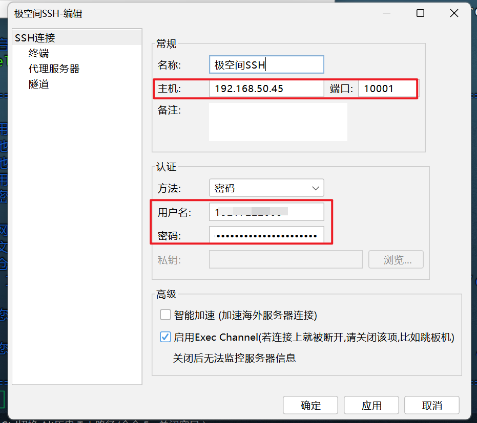 🔺接着使用SSH终端工具连接极空间(我这里演示的工具为“Finalshell”),连接的时候需要输入极空间IP和SSH端口号,以及用户名和密码。