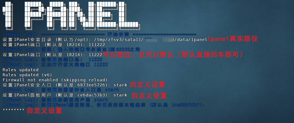 🔺然后就来到1Panel的自定义安装选项。这里要注意的是安装目录是我们前面设置好的“1panel”文件夹的真实路径,至于其它的端口、安全入口、用户名和密码建议大家修改成自己熟悉的。