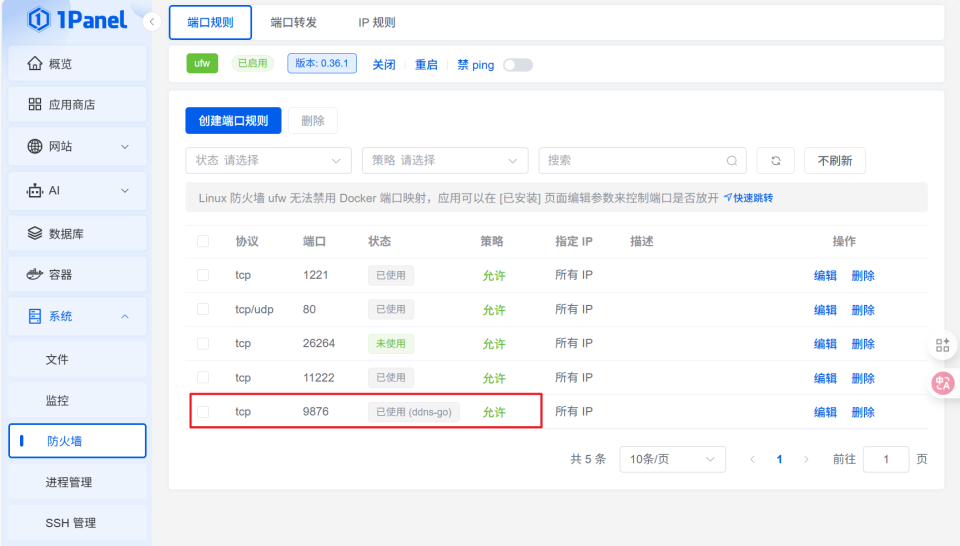 🔺这里友情提醒下,像DDNS-GO这种使用host网络的Docker应用,请记得一顶要在防火墙中将它的端口放行才可以顺利访问。