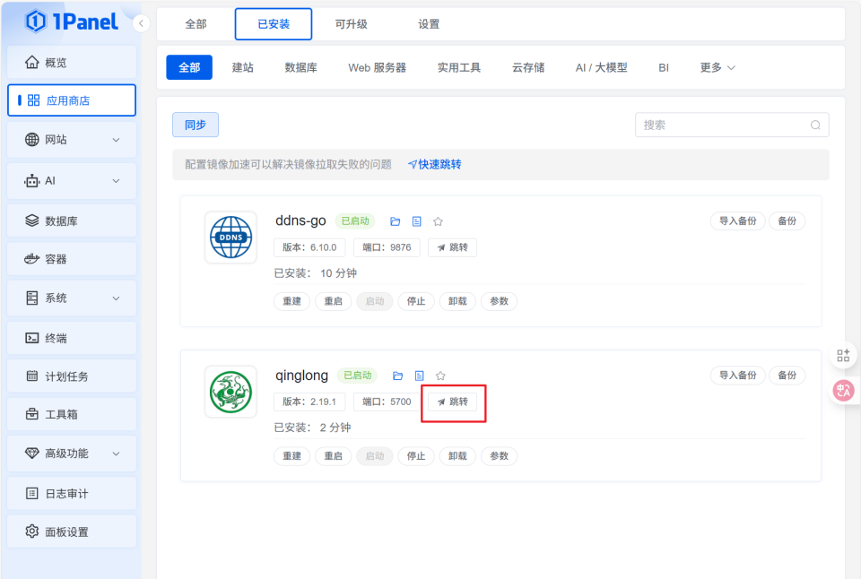 🔺安装好之后就能在“已安装”里面看到了,还可以通过“跳转”一件直达Docker的Web页面(这个操作极空间可要学学哈~)。