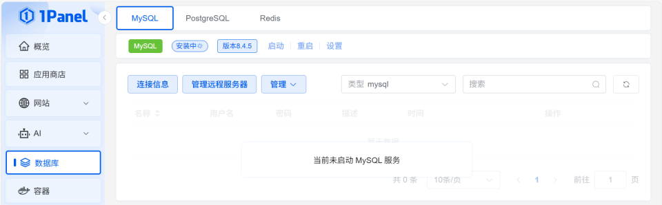 🔺考虑到有建站需求的用户,它这里还有一个专门的数据库管理,至于数据库我们可以直接在它的应用商店中下载常见的MySQL、PostgreSQL、Redis 等,完成后就可以对数据库进行创建、删除、备份操作了。
