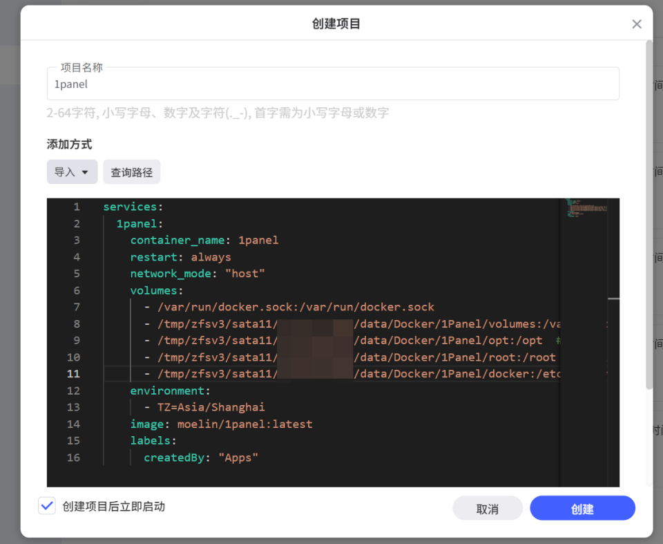 🔺在新增项目页面自定义项目名称,输入以下 Docker Compose 配置信息后点“创建”按钮: