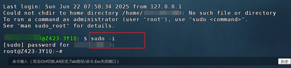🔺进入终端界面以后先输入“sodu -i”命令并回车,接着在输入一遍极空间登录密码,输入密码的时候没有显示,完成之后直接回车即可。