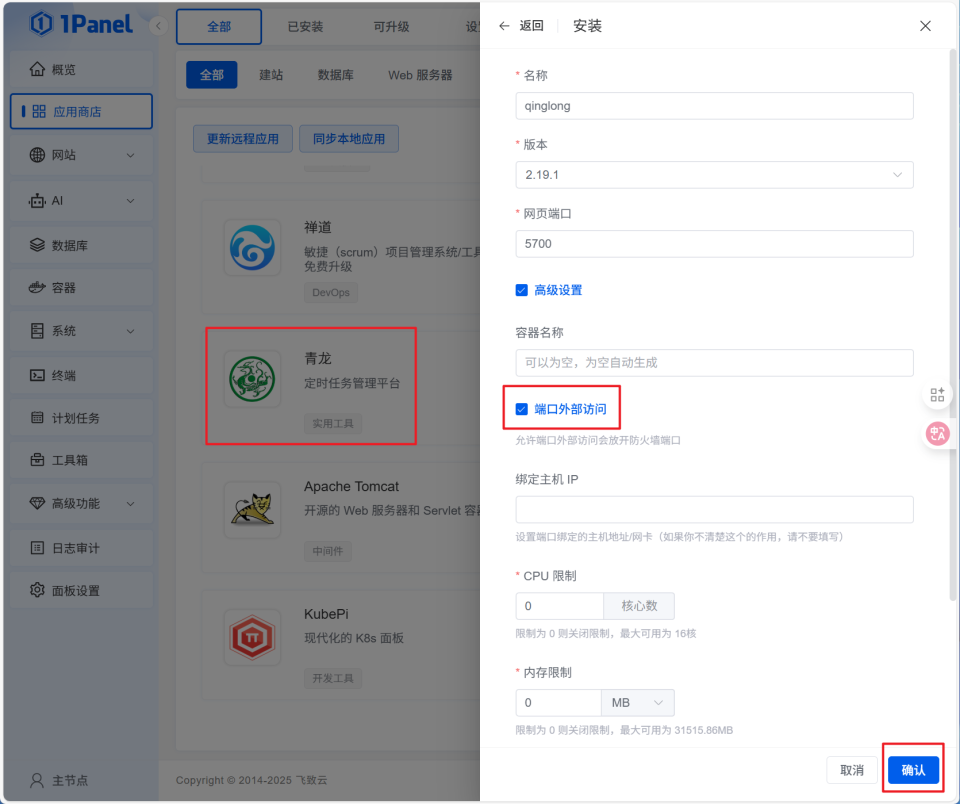 🔺我这里为大家演示“青龙面板”的Docker部署,找到商店内的青龙应用之后直接点安装,一般来说我们几乎不用更改任何参数,主要就是保证“网页端口”本地不冲突,有外网访问的勾选“端口外部访问”,然后直接“确认”即可。