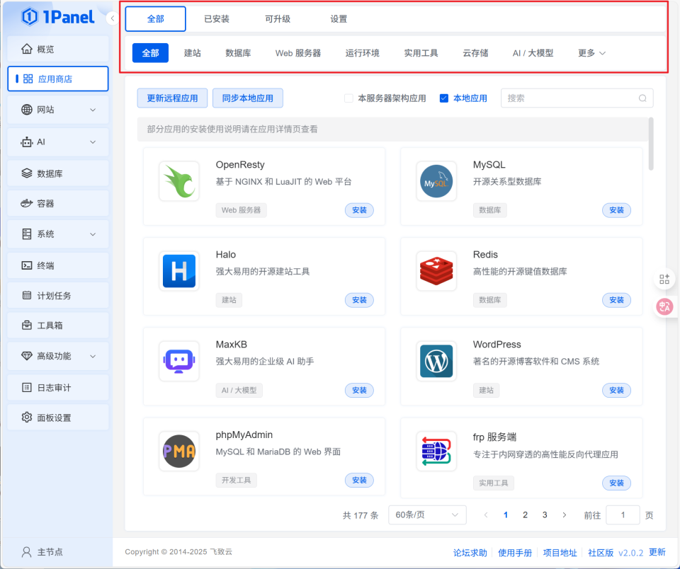 🔺然后就是对于NAS用户及其友好的内置“应用商店”,集成了丰富的开源Docker建站软件和应用。目前这里显示的是177个,并且基本都是非常常见的Docker应用,我们都可以在这里可以一键安装和升级。