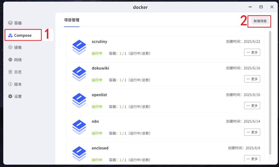 🔺然后打开极空间NAS的“Docker”应用,点击【Compose】 > 【新增项目】。