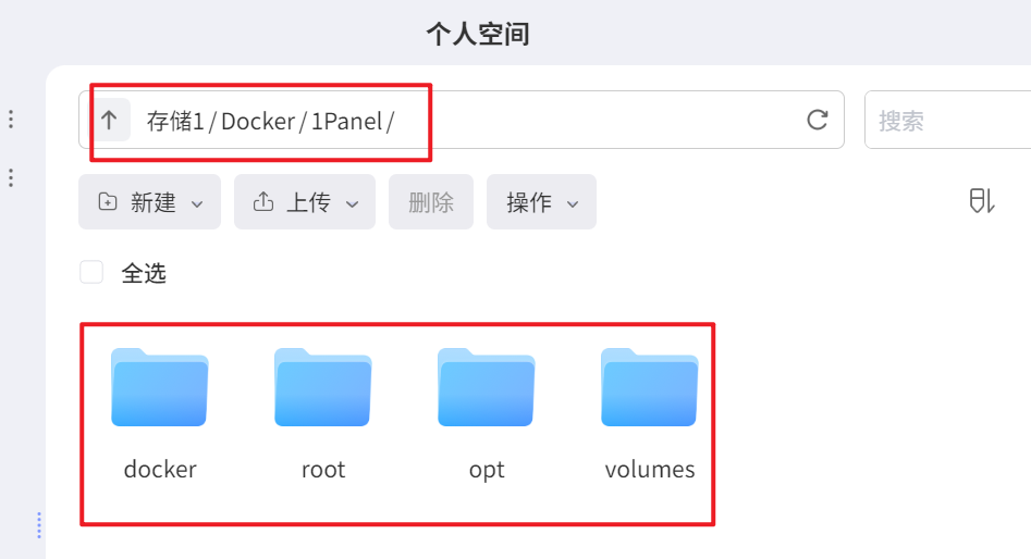 🔺先在文件管理器的Docker目录新建一个1Panel的文件夹,然后在该文件夹下再建docker,root,opt,volumes四个子文件夹。