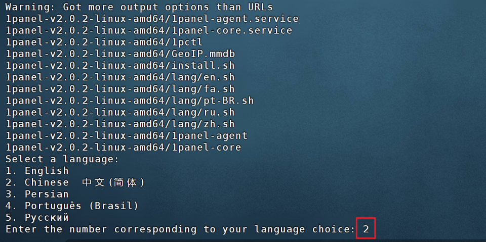 🔺安装包下载好之后它会让我们选择1Panel的语言,我们这里选择“2”(中文)并回车。
