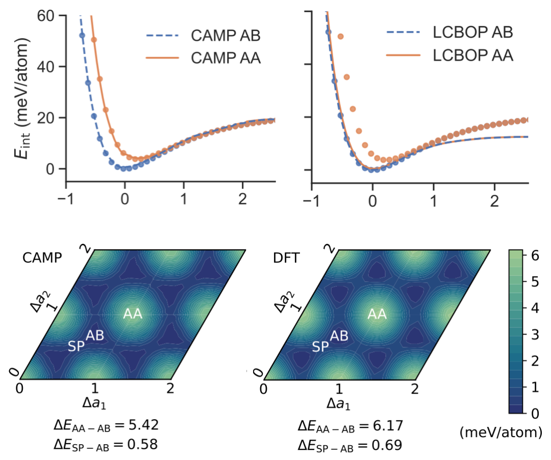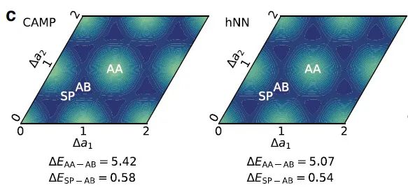 在多层石墨烯材料模拟中,CAMP可以完美复现DFT层间距离改变的能量曲线和层间相对滑移的能量面(图3)。