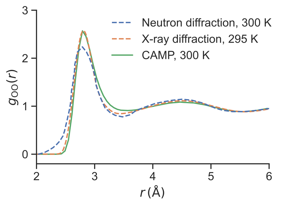 他们在锂电材料、有机分子、水体系及二维石墨烯等多元系统中验证CAMP的卓越性能。在室温下对水进行分子动力学模拟,可以精准预测X射线散射(和中子散射)实验得到的氧-氧径向分布函数(图2)。