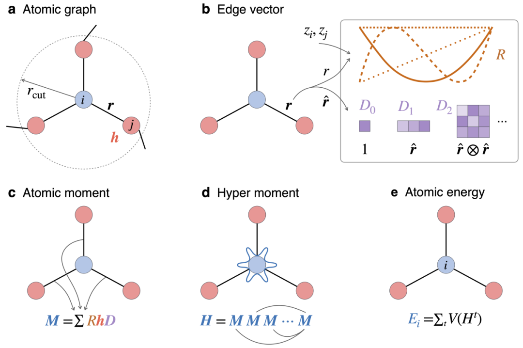 电子科技大学文明健教授团队创新性地提出“笛卡尔原子矩势函数”(CAMP)。该方法实现完全基于笛卡尔空间中原子的x, y, z坐标构建机器学习势函数,建立更简洁、直观的高效建模体系。其技术核心在于直接通过相邻原子空间坐标构建原子矩(类似于力矩),继而融合多原子位置信息精确捕捉复杂相互作用,并嵌入图神经网络框架形成可系统性迭代优化的势函数(图1)。