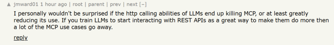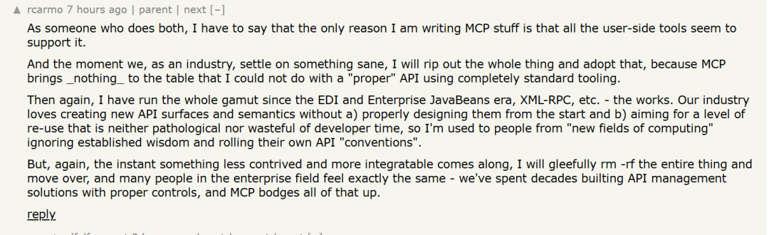 但也有许多老牌程序员对 MCP 抱有强烈的保留意见。他们的核心观点是:MCP 不是突破,而是在重复造轮子。