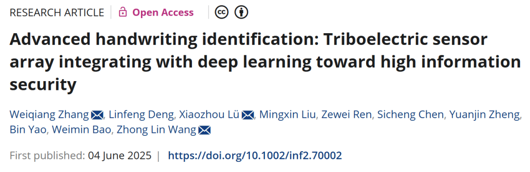 传统笔迹识别主要依赖人工比对,存在实时性差、效率低、成本高等问题;而基于AI图像识别的方法虽实现了自动处理,却在抗伪能力与准确率方面仍存在不足,难以满足高安全场景的需求。近日,西安电子科技大学张维强副教授、吕晓洲教授联合北京纳米能源与系统研究所王中林院士和兰州理工大学邓林峰教授,提出了一种融合摩擦电传感器阵列与深度学习技术的高精度笔迹识别方案,显著增强了对临摹、描摹签名的判别能力,为信息安全提供了全新解决路径。该研究构建了一套基于摩擦纳米发电机(TENG)和深度学习算法的自驱动笔迹识别系统(HWIS)。系统由摩擦电传感器阵列构成的自供能手写信号采集装置、深度学习特征提取模块以及单类支持向量机分类器组成,可实现对签名行为全过程的高精度记录与真伪判断。