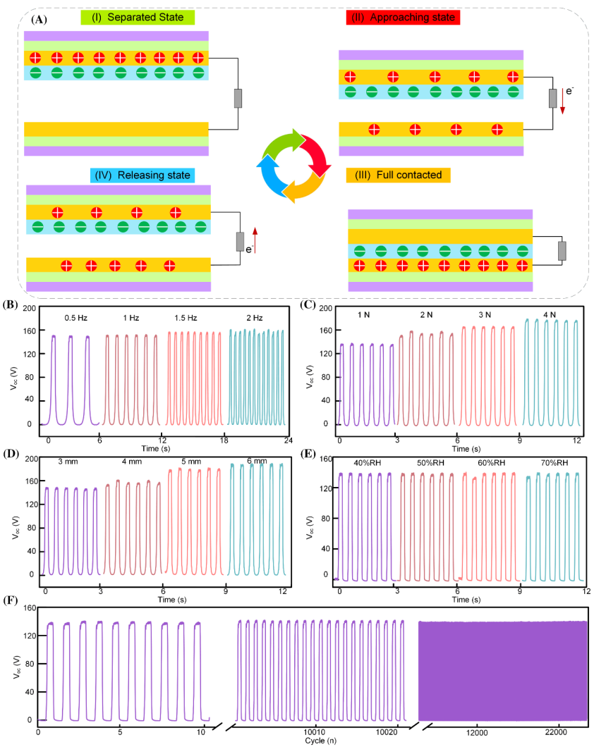 图2. 摩擦电传感器的工作原理和输出特性。(A)摩擦电传感器的工作原理。(B)不同频率下的开路电压。(C)不同驱动力下的开路电压。(D)不同接触分离距离下的开路电压。(E) 不同相对湿度下全封装摩擦电传感器的开路电压。(F)全封装摩擦电传感器的稳定性和耐久性测试。