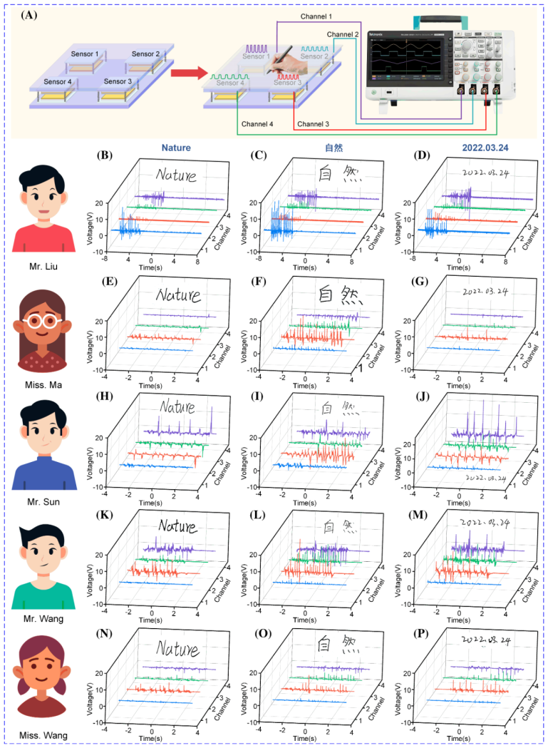 图3.英文字符 “Nature”、汉字 “自然” 和数字字符 “2022.03.24” 的手写笔迹信号及其真伪对比。(A) 使用摩擦电传感器阵列收集手写信号的过程示意图。(B-D)真实书写者L的笔迹图像和笔迹信号。(E-G)伪造者M的描摹笔迹图像和笔迹信号。(H-J) 伪造者S的描摹笔迹图像和笔迹信号。(K-M) 伪造者W的描摹笔迹图像和笔迹信号。(N-O)伪造者W的描摹笔迹图像和笔迹信号。