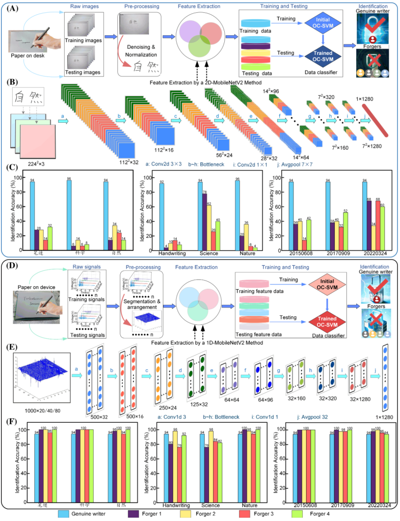 图4. HWIS系统与笔迹识别结果对比分析。(A)基于笔迹图像的识别系统整体架构。(B)用于图像特征提取的二维轻量级神经网络模型(2D-MobileNetV2)结构。(C)真迹作者的笔迹图像和伪造者仿制的英文、中文和数字字符笔迹图像的识别精度。(D)基于动态手写信号的HWIS系统整体结构框架。(E)用于动态信号特征提取的一维轻量级神经网络模型(1D-MobileNetV2)结构。(F)HWIS系统在英文、中文及数字笔迹识别任务中对真实签名与伪造签名的分类准确率。