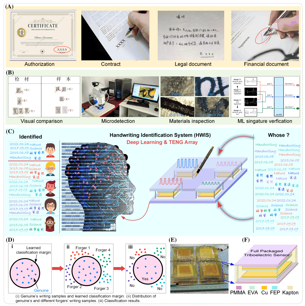 图1. 笔迹识别概览。(A)典型笔迹识别应用场景。(B)传统的笔迹识别方法。(C)由深度学习方法实现的 HWIS 和基于摩擦电传感器阵列的自供电手写信号采集装置的示意图。(D)真迹样本和伪造者笔迹样本分类过程的示意图。(E)摩擦电传感器阵列实物图。(F)完全封装的摩擦电传感器单元结构示意图。