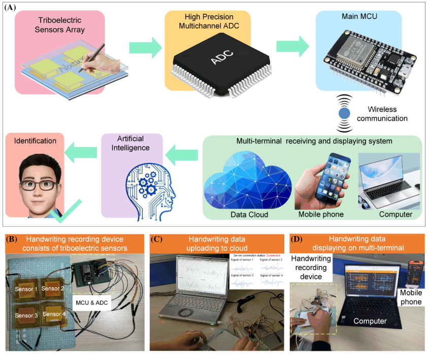 图5.手写信号采集、无线传输、上传到数据云并在多终端上显示。(A)系统的流程图,包括手写模拟信号采集、处理/无线传输、人工智能和识别。(B)由摩擦电传感器阵列组成的手写信号采集和无线传输系统的照片。(C)手写信号数据上传到数据云。(D)手写信号数据无线传输到多个终端并显示。