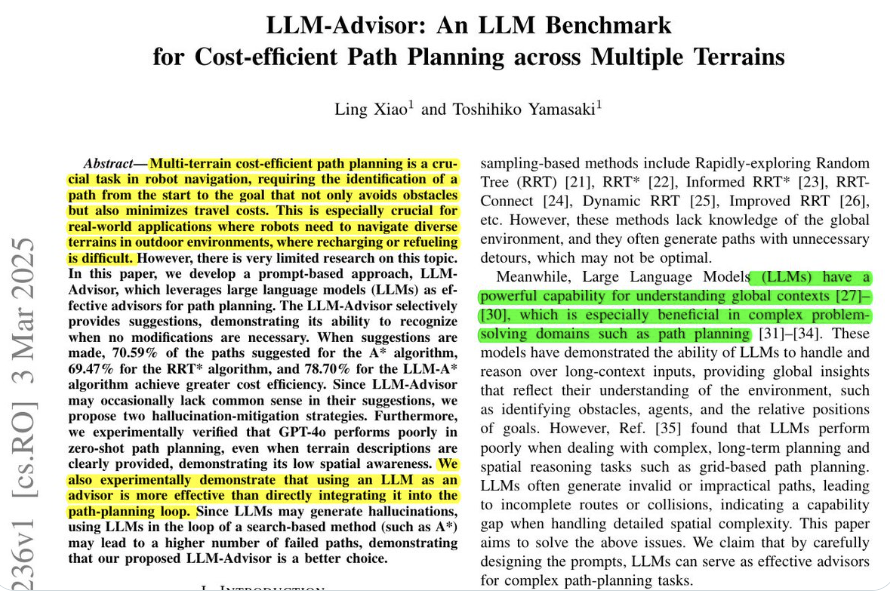 另外,发表在 arXiv 的一项研究也指出,通过设计提示词,大语言模型在户外导航中优化多地形环境的路径规划。