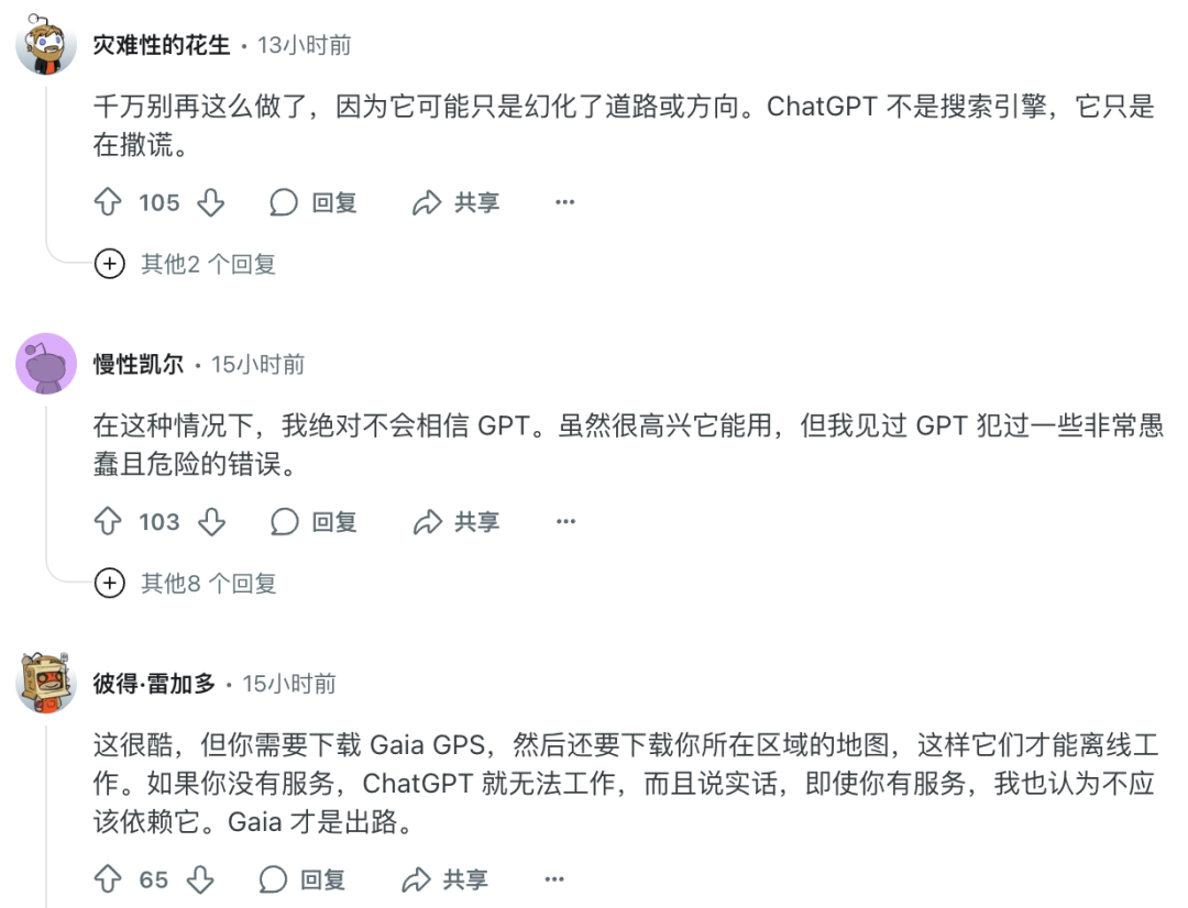 后来有人开始求助 ChatGPT:每隔几分钟就把 GPS 坐标发给它,结果 GPT 回复了清晰的指南针指示、道路名称和地形信息,最后顺利引导他们安全回家。
