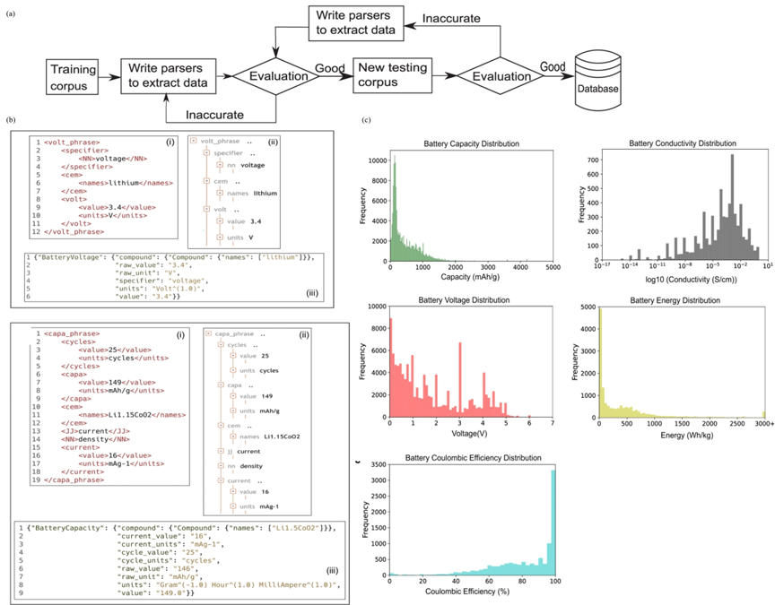 图2. 电池材料数据库构建工作流程与数据分布特征:(a) 电池材料数据自动化提取流程;(b) 电压/容量数据的多模态解析范式;(c) 电池材料五性质分布统计。
