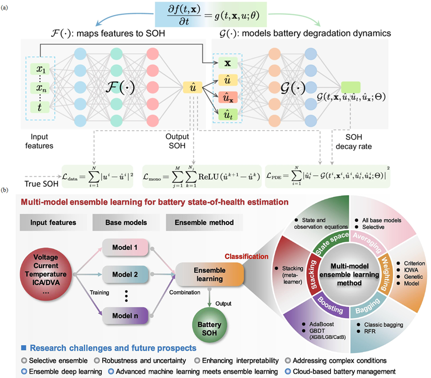 图 5. 电池健康评估的机器学习训练流程:(a)物理信息神经网络(PINN)结构;(b) 电池健康评估的多模型集成学习过程。