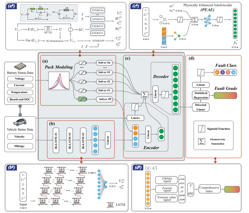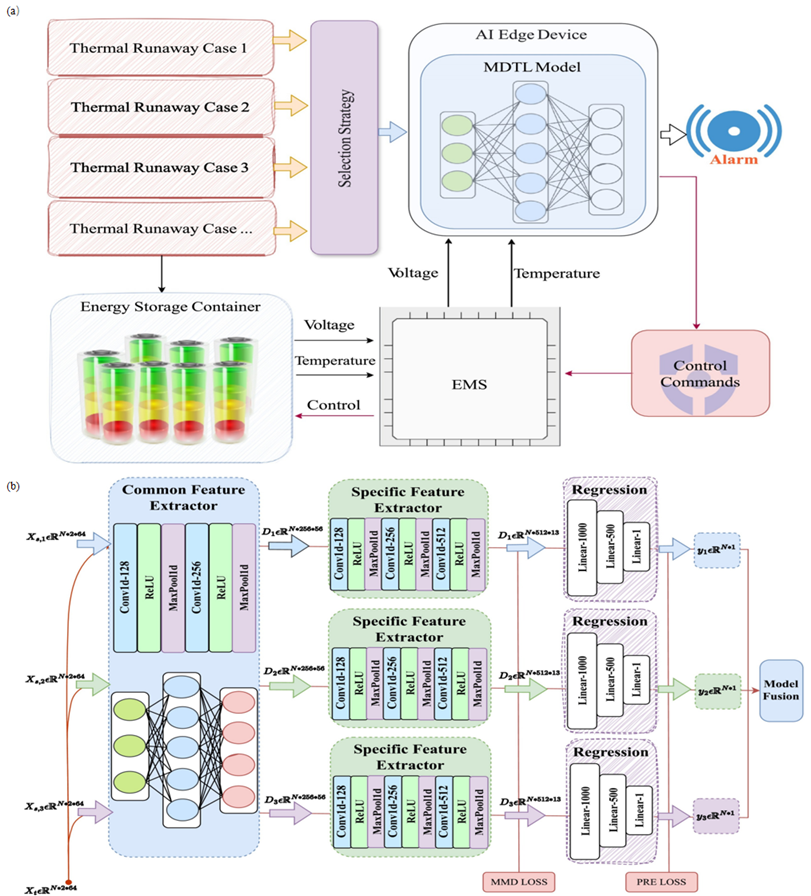图 7. 用于电池热失控诊断的多源域迁移与小样本学习方法:(a) 多源域迁移学习(MDTL)算法应用流程与预警机制;(b) 具有多源域特征解耦与融合的 MDTL 算法架构。