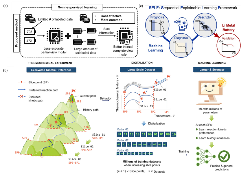图 4. 机器学习预测电池状态流程图:(a) 利用有限标注数据进行电池寿命预测的半监督学习工作流程;(b) 温度特征挖掘在机器学习中的作用;(c) 基于早期循环电化学数据的可解释框架。