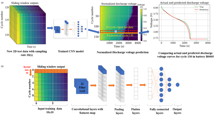 图 3. 用于自动化健康状态(SOH)估计的深度学习框架:从二维电压编码到预测特征提取。(a) 多阶段电压预测工作流程;(b) 用于自主特征学习的一维卷积神经网络架构。