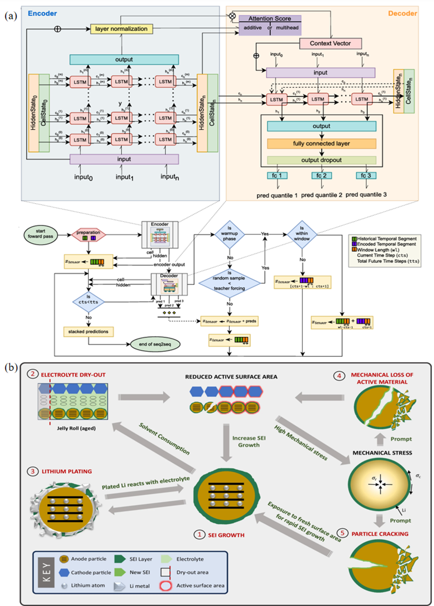 图 9. 结合退化模式分析的电池寿命预测框架。(a)编码器-解码器架构及集成序列到序列模型的工作流程;(b)五种退化机制耦合的电池老化模型架构。