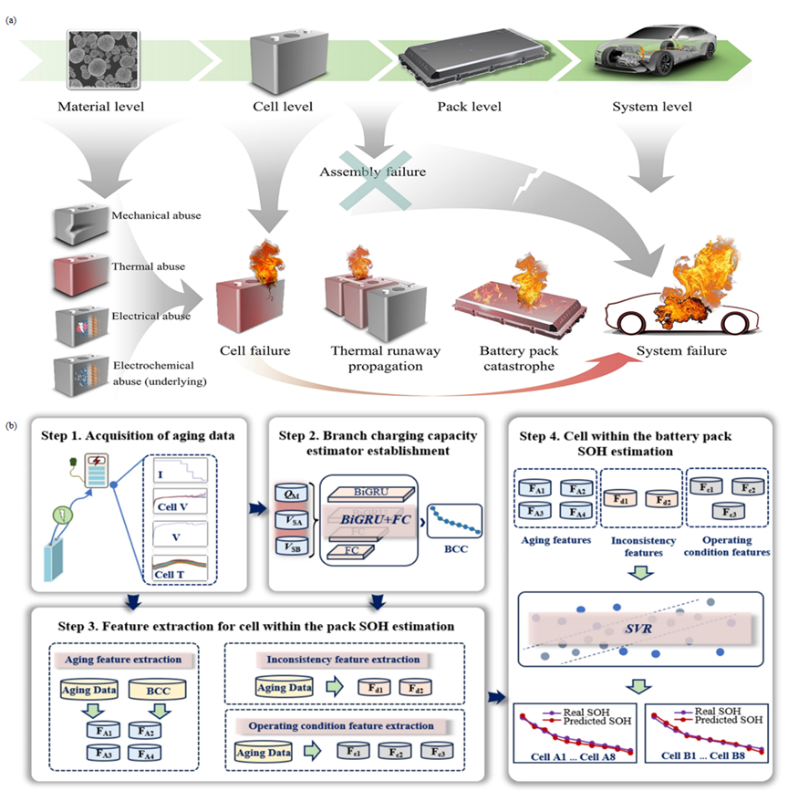 图1. 电动汽车电池故障分析及状态评估流程。(a) 电动汽车电池灾难性故障的过程;(b) 电池包内单体健康状态(SOH)估算流程图。