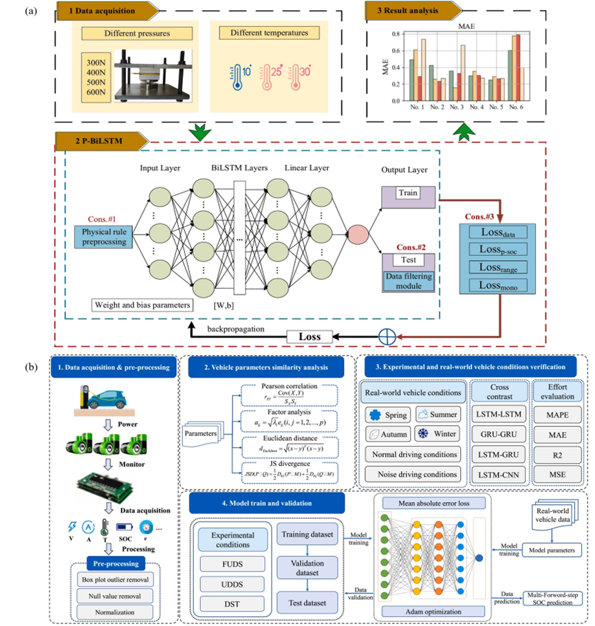 图 6. 用于锂离子电池荷电状态(SOC)估计与预测的物理约束神经网络架构:(a) 用于 SOC 估计的物理约束双向长短期记忆网络(LSTM)架构;(b) 基于相似性驱动特征选择的 LSTM-GRU 混合框架用于多步 SOC 预测。