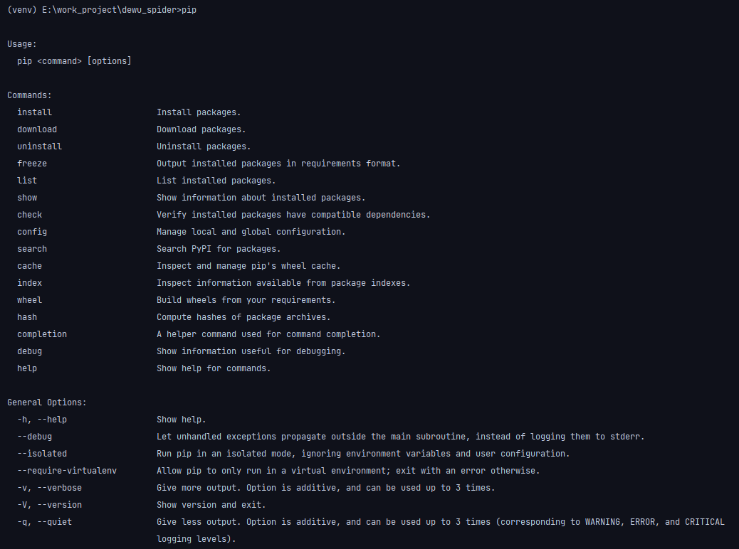 如何使用 安装后,在命令行中输入pip,然后按下回车,就会出现下图所示的使用说明: