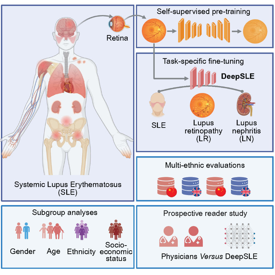 在前期医工交叉研究积累的基础上,盛斌教授团队成功构建了全球首个基于普通彩色眼底照相的系统性红斑狼疮智能筛查系统—DeepSLE。该系统在“预训练-迁移学习”的框架下,创建课程式训练策略并突破传统机器学习范式,不仅实现SLE的无创检测,更首次通过视网膜影像对狼疮性视网膜病变、狼疮性肾炎等并发症进行有效预测,为多器官损伤预警提供了全新路径。它使用来自 173,346 名参与者的 666,383 张眼底图像对 DeepSLE 系统进行预训练。在包含来自中国和英国的 247,718 张图像的多民族验证数据集中,DeepSLE 的SLE 曲线下面积 (AUROC) 达到 0.822~0.969。此外,DeepSLE 在按性别、年龄、民族和社会经济地位分层的亚组中均表现出稳健的表现。为了确保 DeepSLE 的相关性和可解释性,团队进行了显著性分析和视网膜血管变量分析,以深入了解其 SLE 检测的诊断机制。