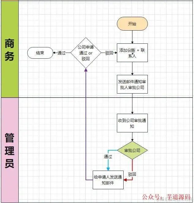 流程图核心流程总结为一句话:商务角色申请添加公司后由管理员进行审批 。