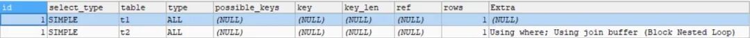在上面的例子中,t1 表和 t2 表都没有加索引,如果做 join 查询,在 MySQL 8.0 以前,会使用 BNL 算法。