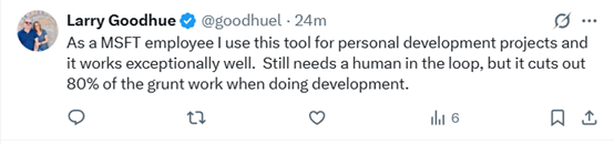 作为一名微软员工,我将这个工具用于个人开发项目,它的表现非常出色。虽然在使用过程中仍需要人工参与,但在开发工作里,它能帮我省去 80% 的繁琐编程任务。