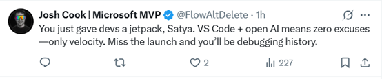 Satya你这是给开发者们装上了喷气背包啊。有了VS Code和开源AI的加持,就没什么借口可找了,只剩下一路高歌猛进。