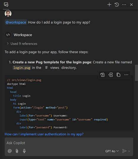 例如,询问“这个项目中的认证是如何工作的”“数据处理函数中的内存泄漏是什么原因”“为支付处理服务添加错误处理”“添加登录表单和后端 API”等问题。